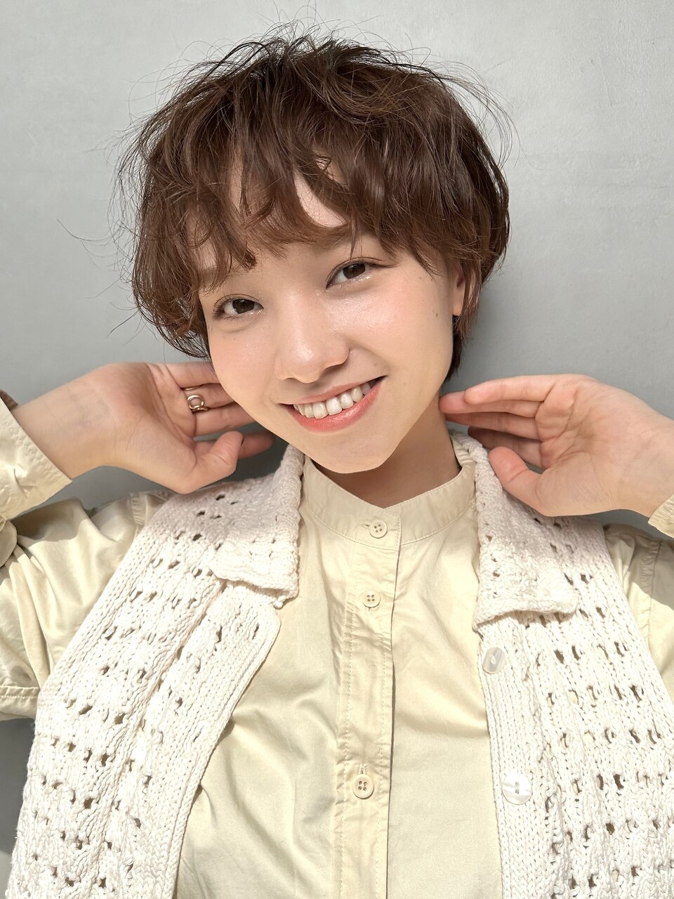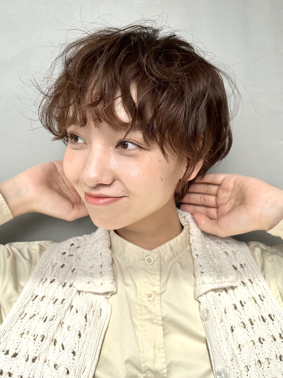 前髪にスパイラルの質感と全体をナチュラルな動きを出したスタイル。カラーはベージュブラウンで柔らかみを出します。仕上げはニュアンスな動きとふんわり感が出るようにムースワックスを揉み込みます