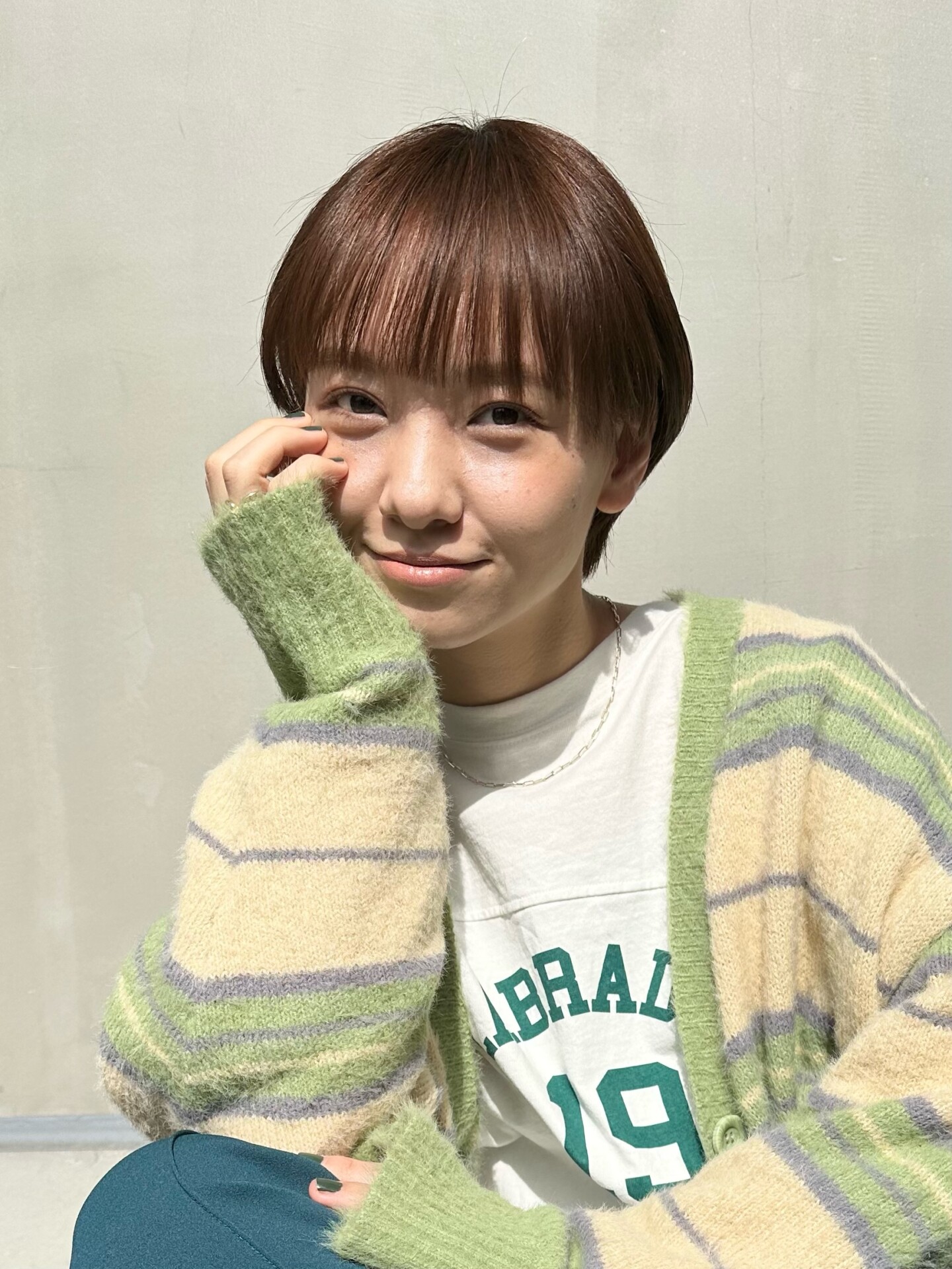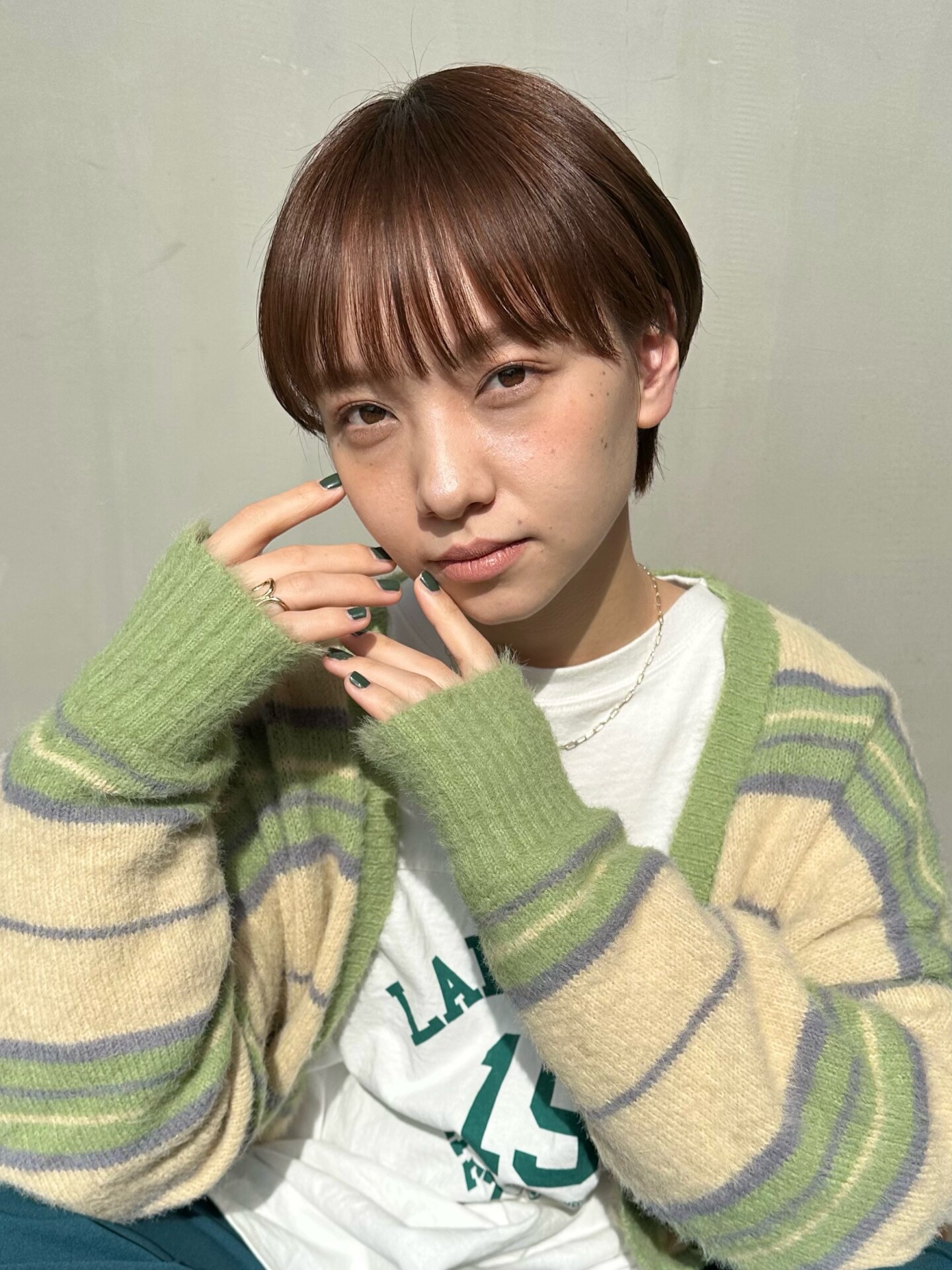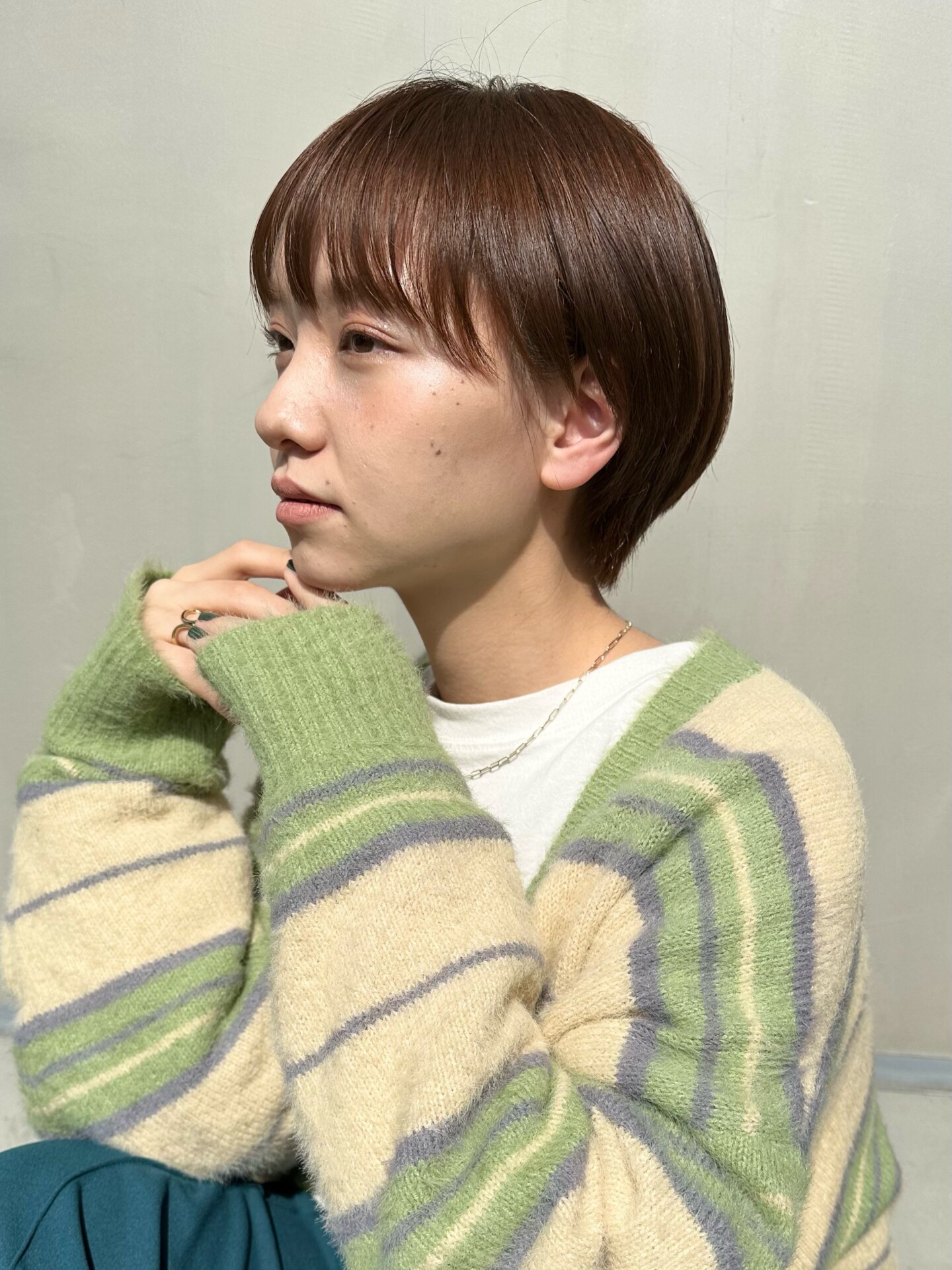 顔まわりの柔らかさとサイドから見た時の美シルエットが可愛いショートボブ。サイドの髪を耳にかけるとより可愛いさプラス!スタイリングもバームなどでまとまりと艶を出せばOK。