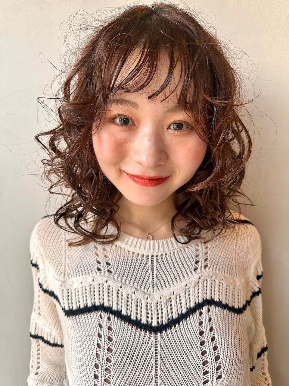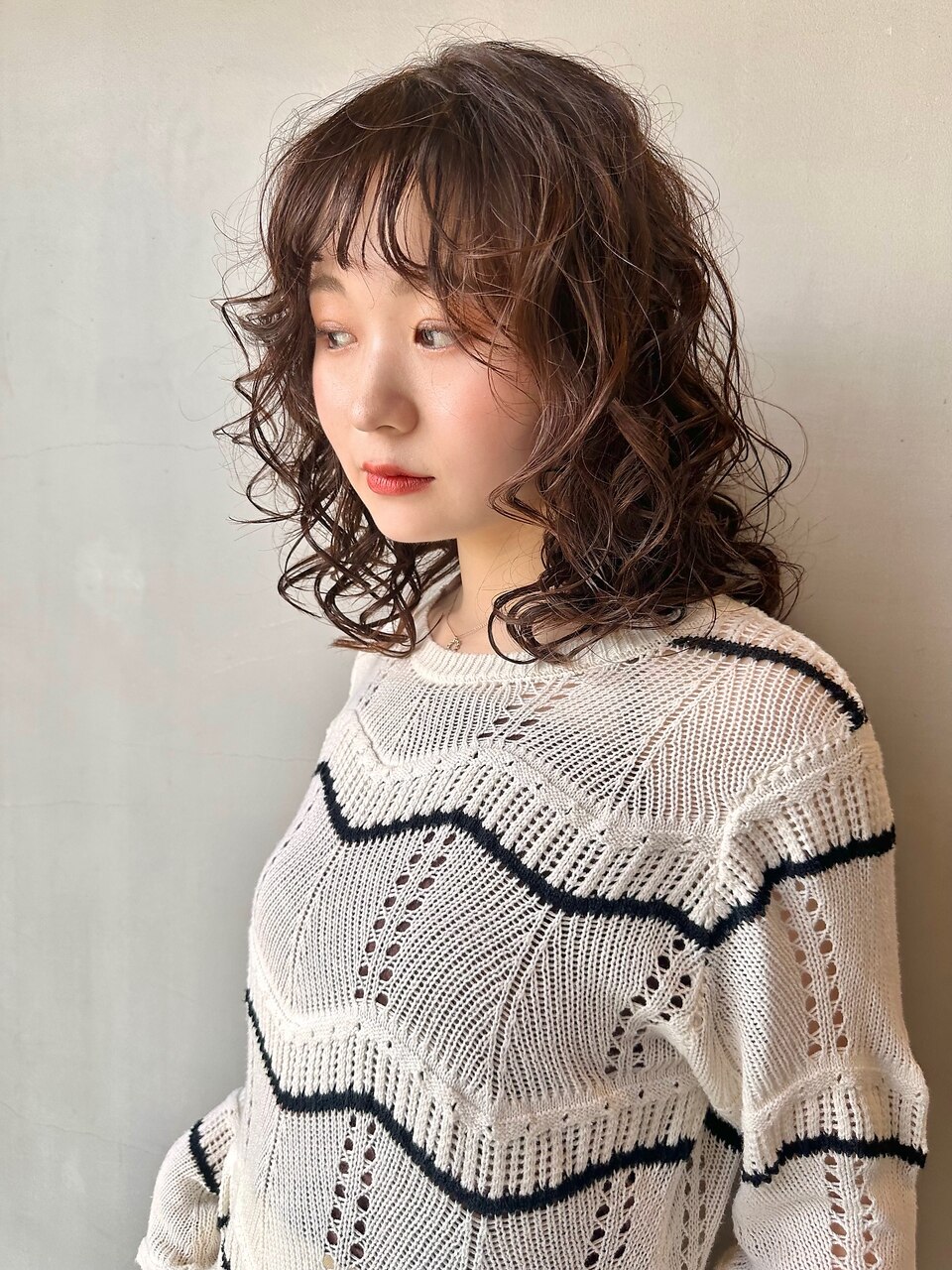 大きめのリッジのスパイラルパーマ、前髪はピンパーマで緩めの毛流れを。カラーはベージュブラウンで秋色に!