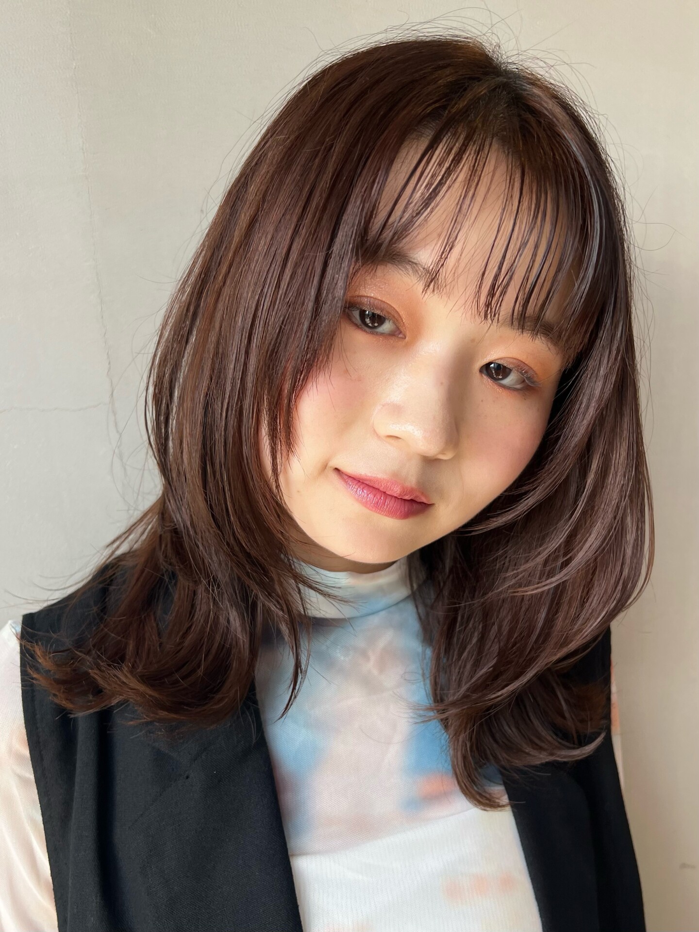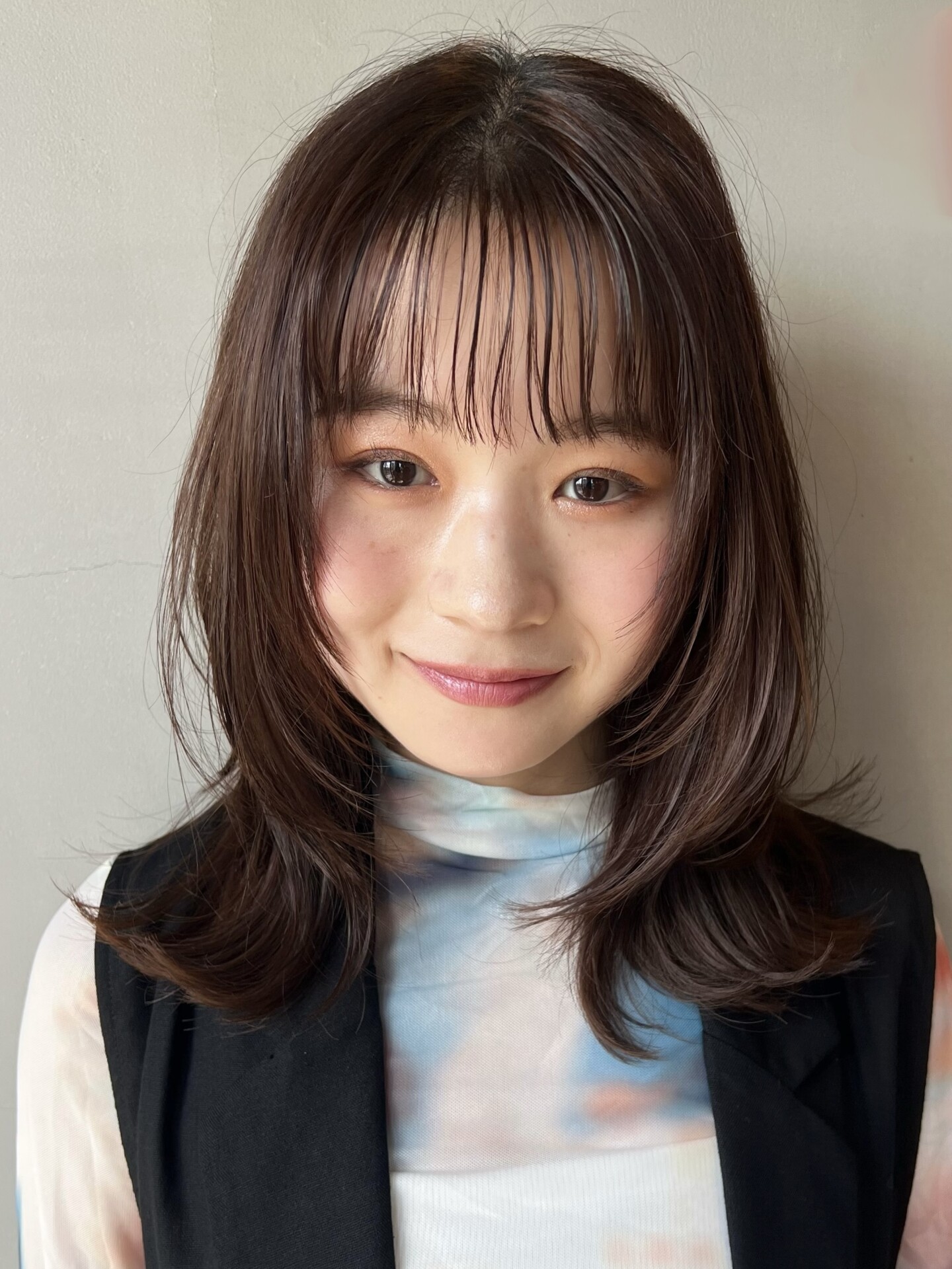 お顔まわりたっぷりレイヤーのミディアムスタイル。