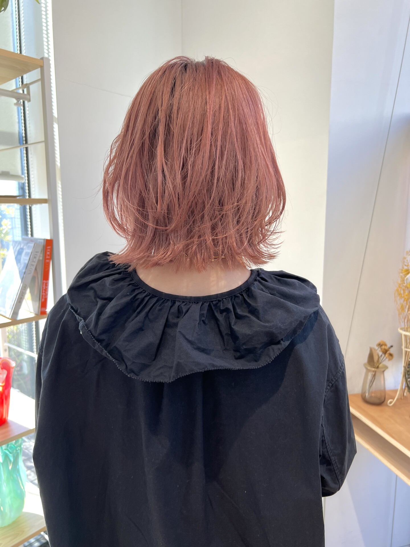 ワンカール巻くだけでふんわり動く軽めなレイヤーボブとピンクカラー。多毛で短くすることができなかった方にも、扱いやすいボブスタイルです!ピンクカラーはブリーチして明るくすることでより柔らかい印象に◎毎朝のスタイリングが楽しくなるヘア!