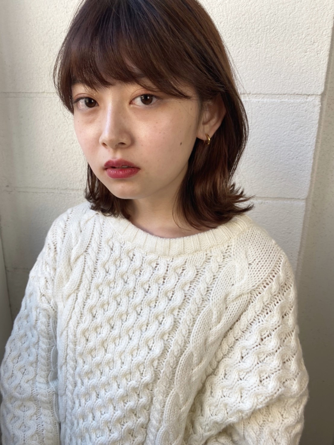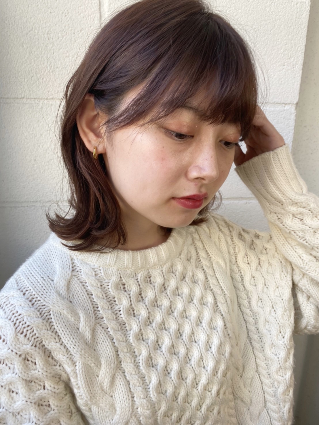耳掛けですっきりミディアムヘアー。ナチュラルな外ハネが可愛さを演出します。
