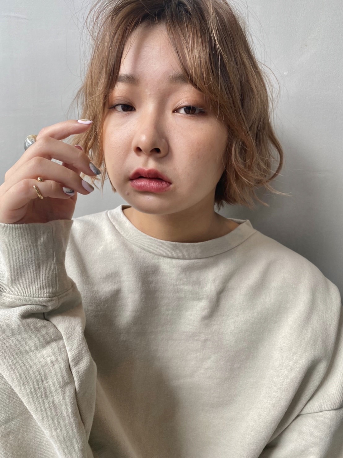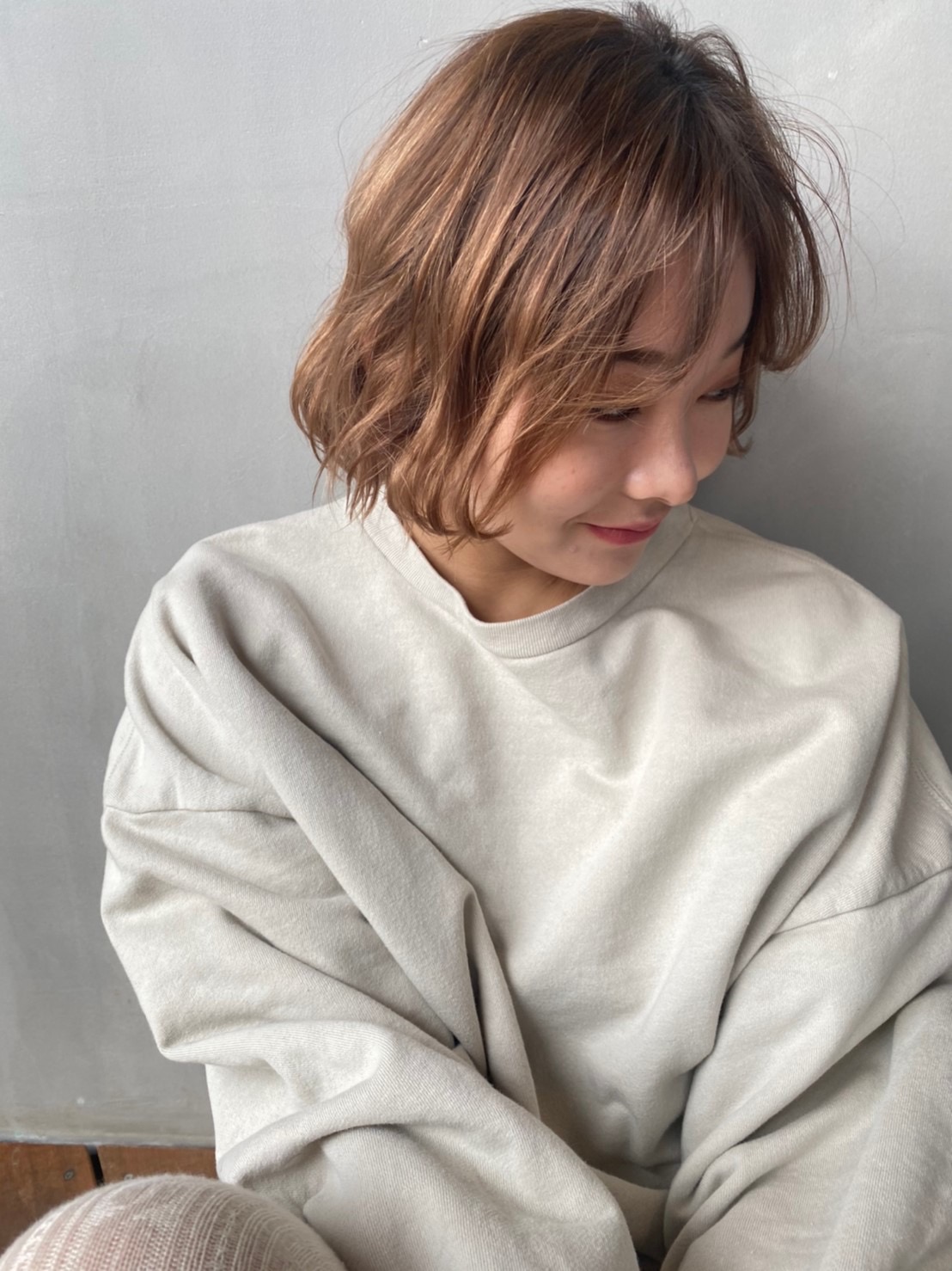 綺麗にまとめないのが可愛いクセ毛風ボブ。外ハネ感やウェーブのミックスで全体に動きを演出します。前髪が短くても可愛いスタイルです。