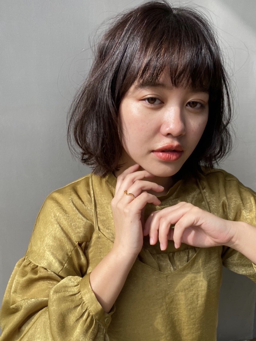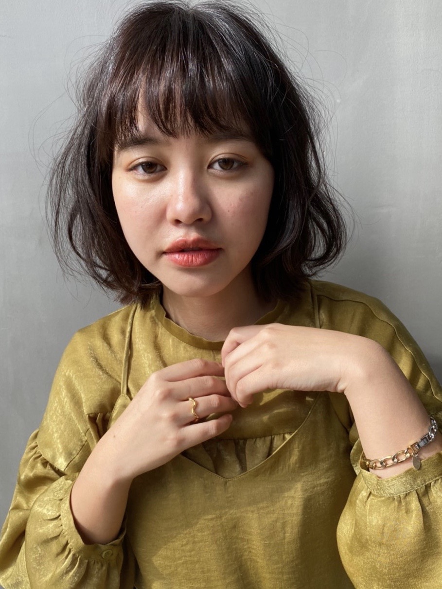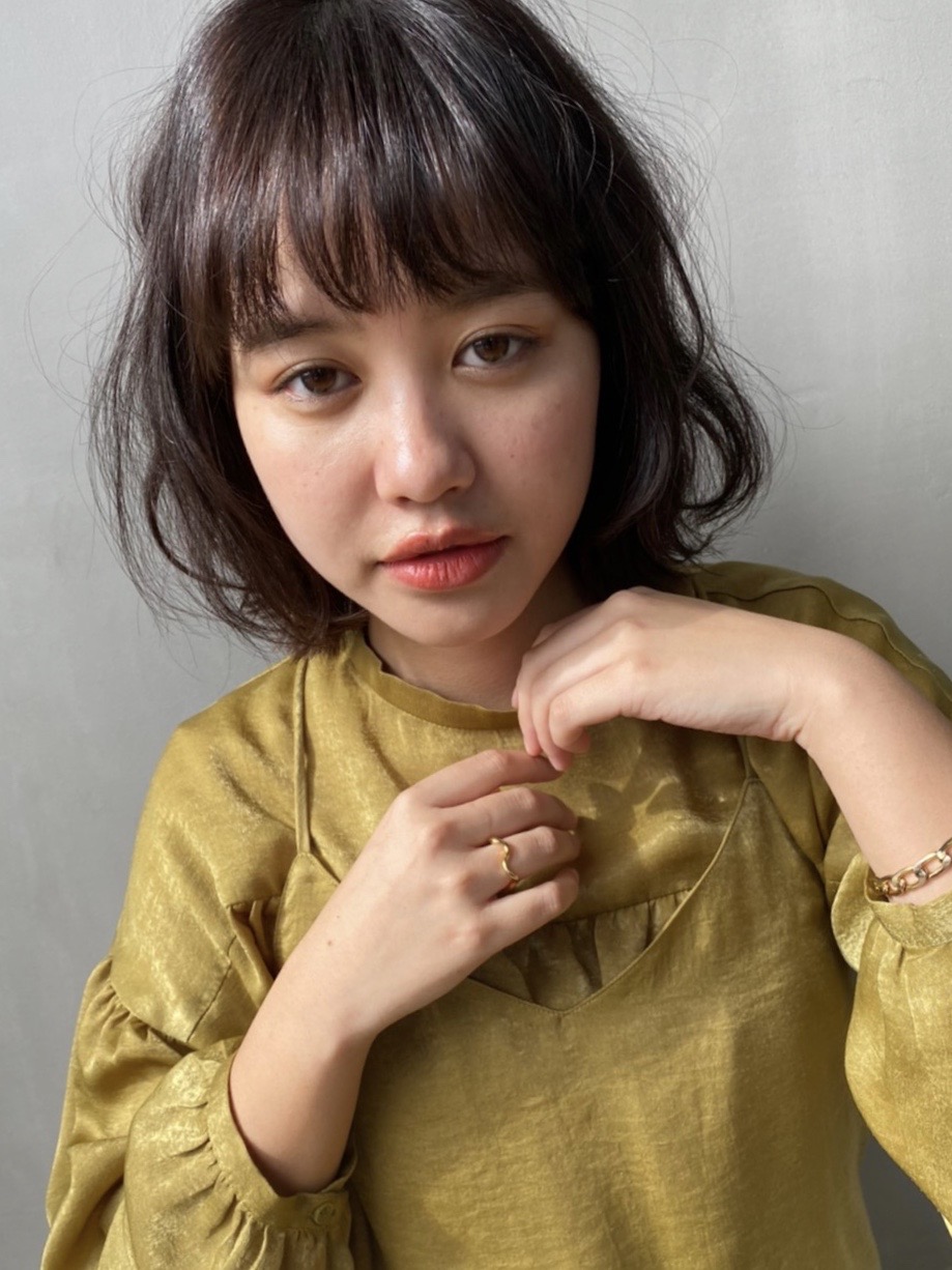 ゆるいウェーブと外ハネが可愛いミディアムボブ。アンニュイな質感がおしゃれな雰囲気と可愛らしさをプラスします。