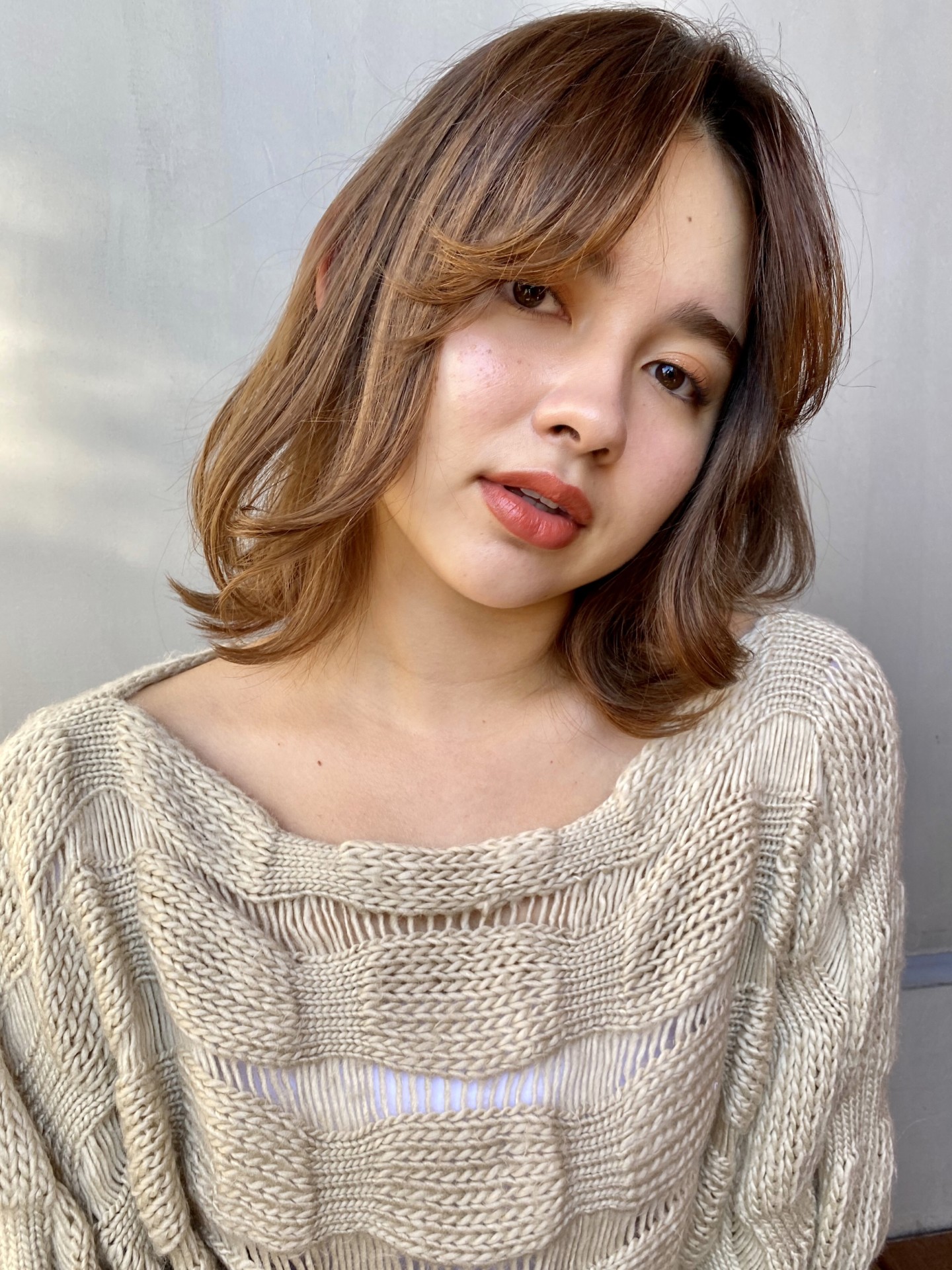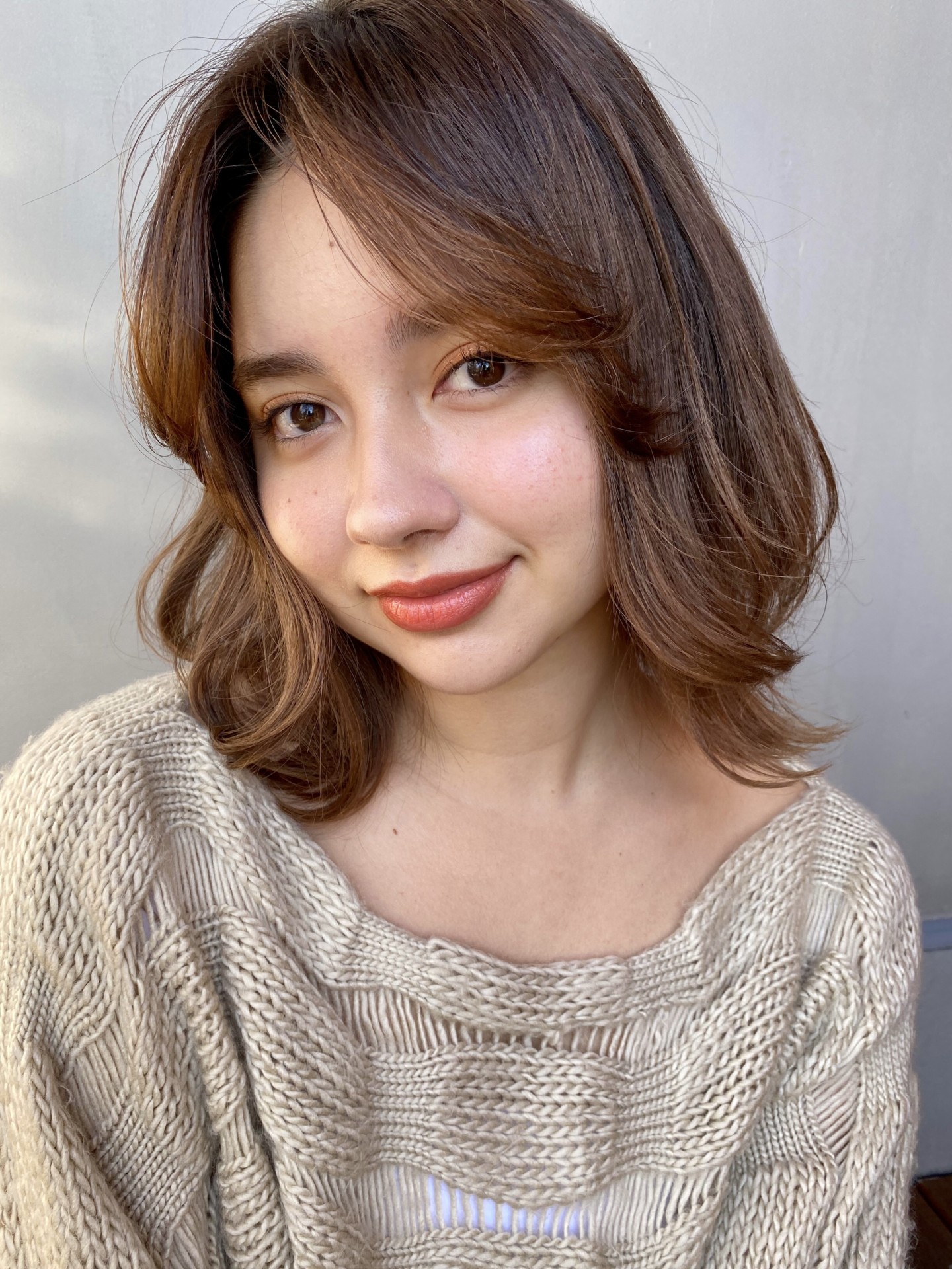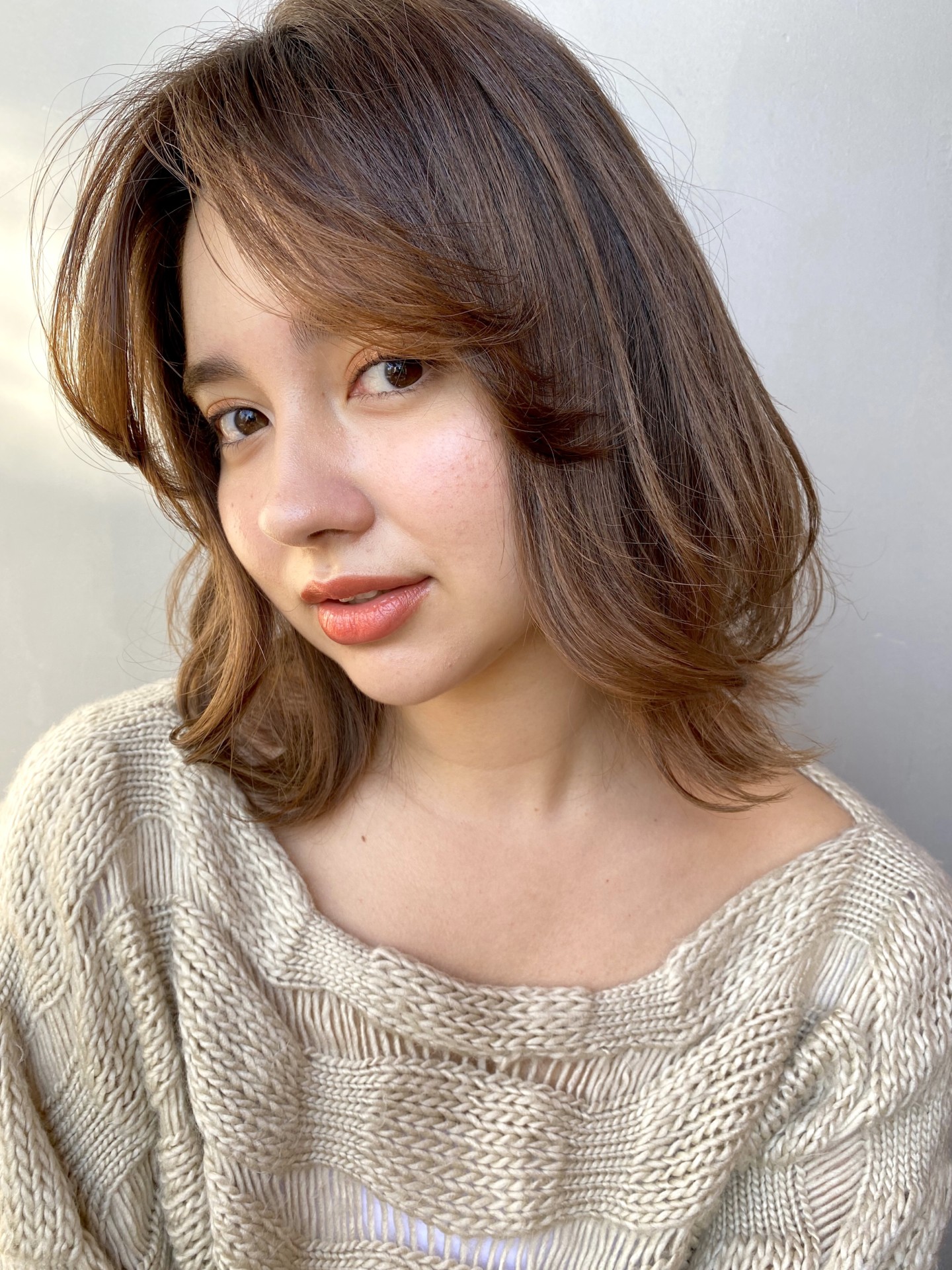 前髪をセンターパートでリバースにし毛先をワンカールにする事で重ためだけど動きのあるスタイルに!