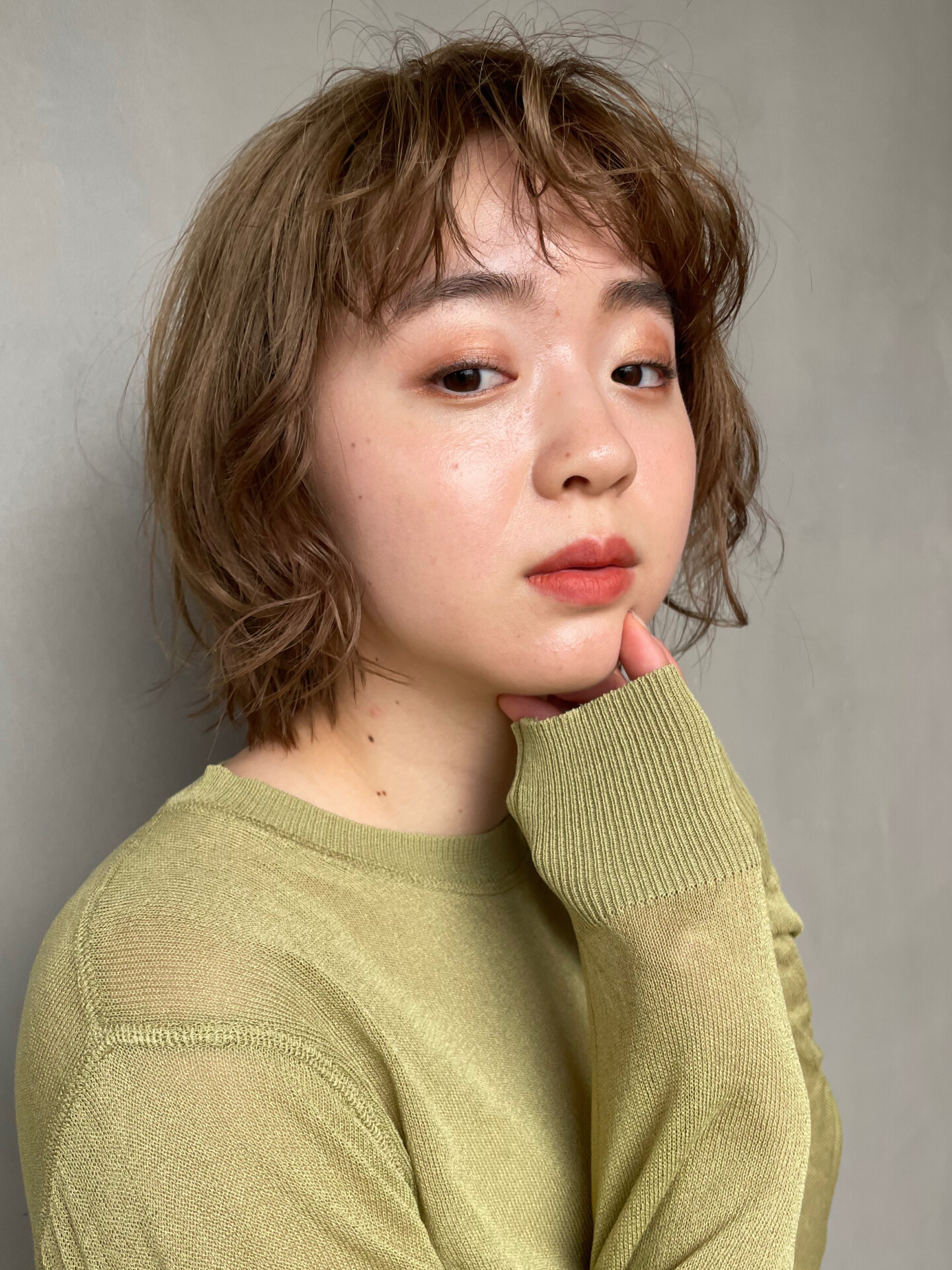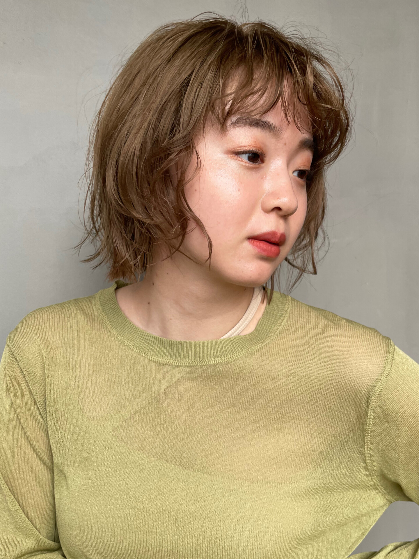 前髪と毛先を緩く巻いたハイトーンのボブスタイル!カラーはブリーチ後に赤みを抑えたカーキベージュ柔らかい色合いに!