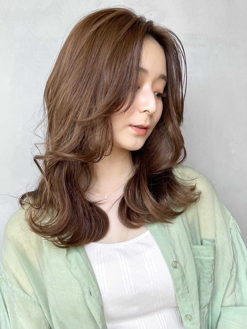 外ハネと顔まわりのレイヤーで作る、韓国っぽスタイル!長めの前髪と顔まわりのレイヤー部分をリバースで巻けば可愛いくびれスタイルの完成です!カラーはハイトーンのベージュ系で軽さを出した夏色に♪