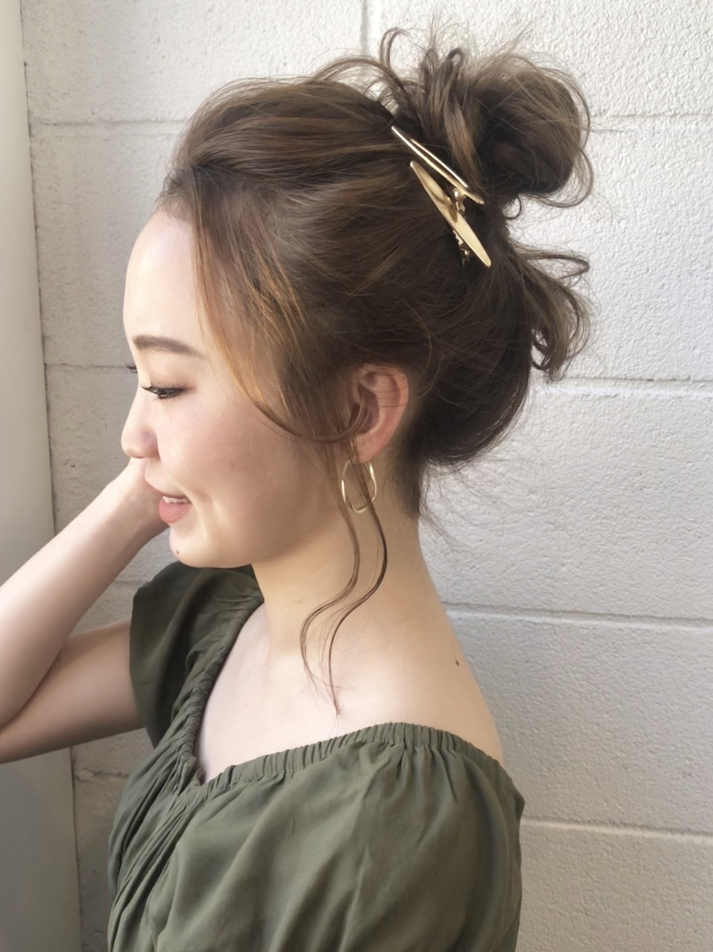 それ以外の髪を高めの位置でザックリとラフなお団子にします。