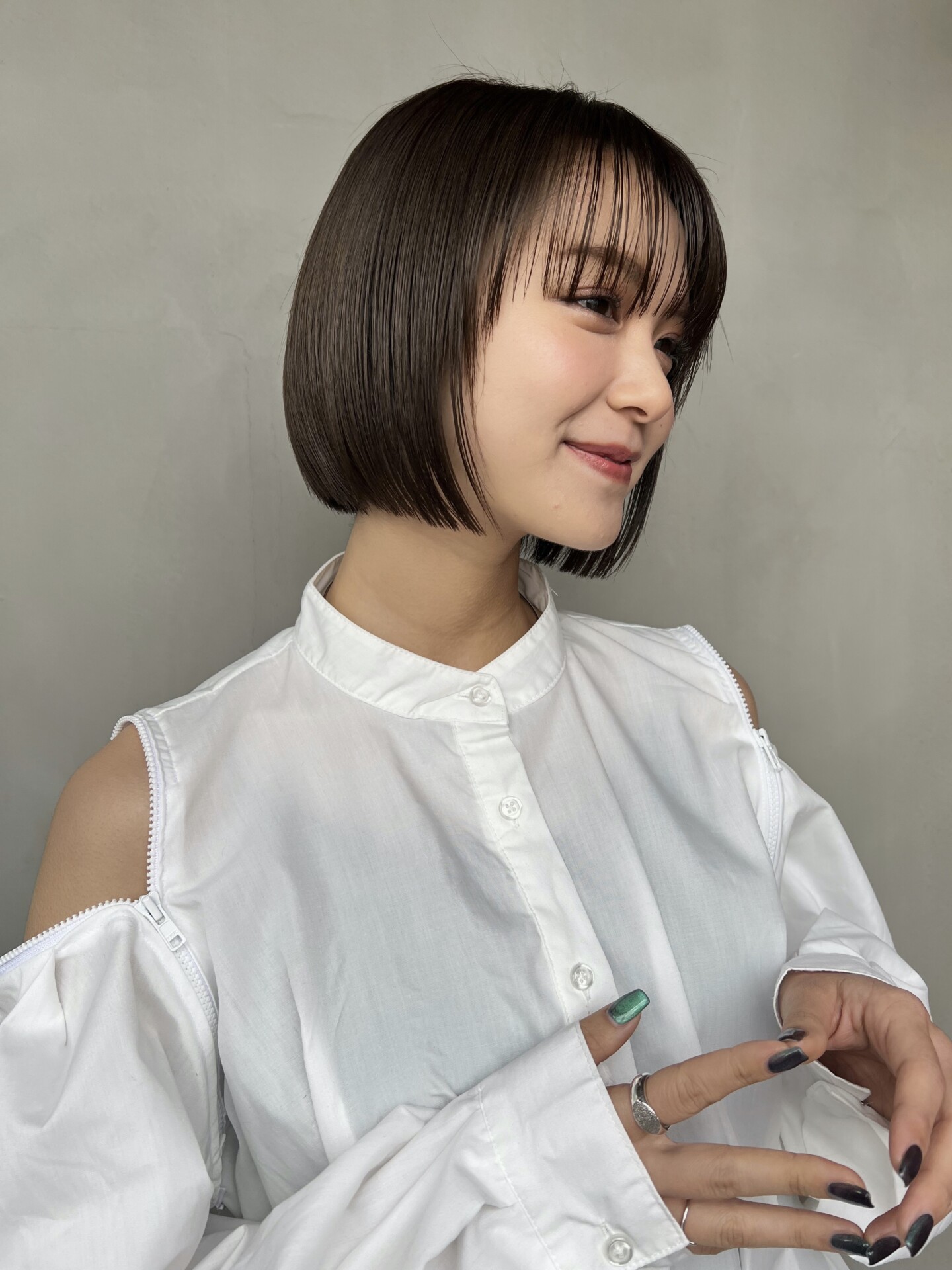シャープで美しいカットラインにこだわったコンパクトなミニボブスタイル*乾かすだけで可愛い再現性を大事に丁寧にカットします。シンプルなスタイルですが、長さ・カットラインの角度・丸みの付け方・顔周りのデザインなどなど、似合わせポイントはたくさん!ボブスタイルも是非お任せください!