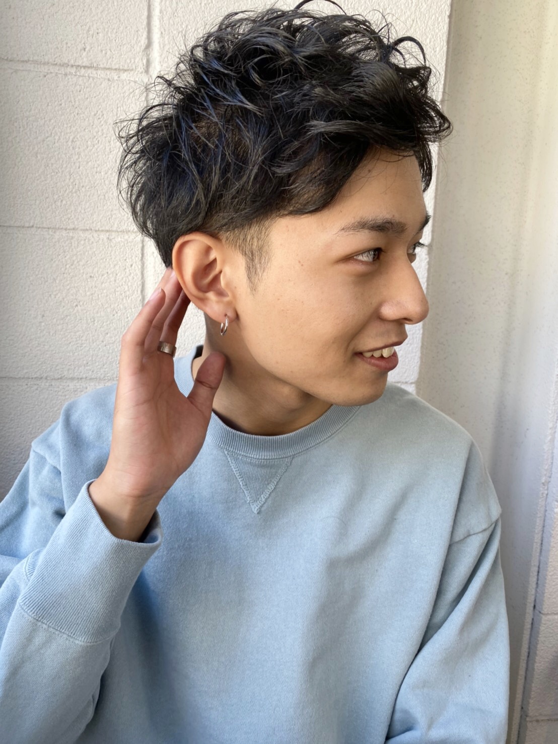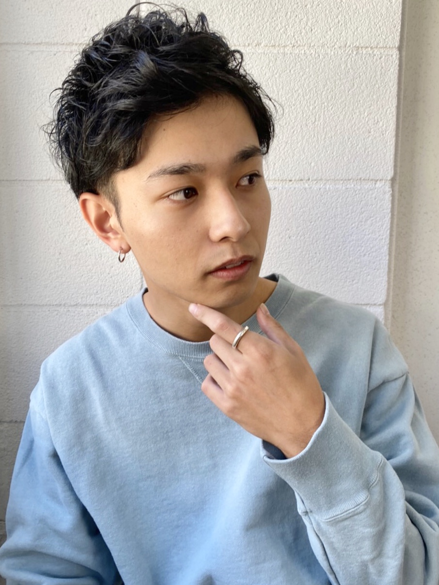 ツーブロックと刈り上げでスッキリとさせつつ、トップはパーマでルーズ感を出してクシャッとスタイリングをしやすく。