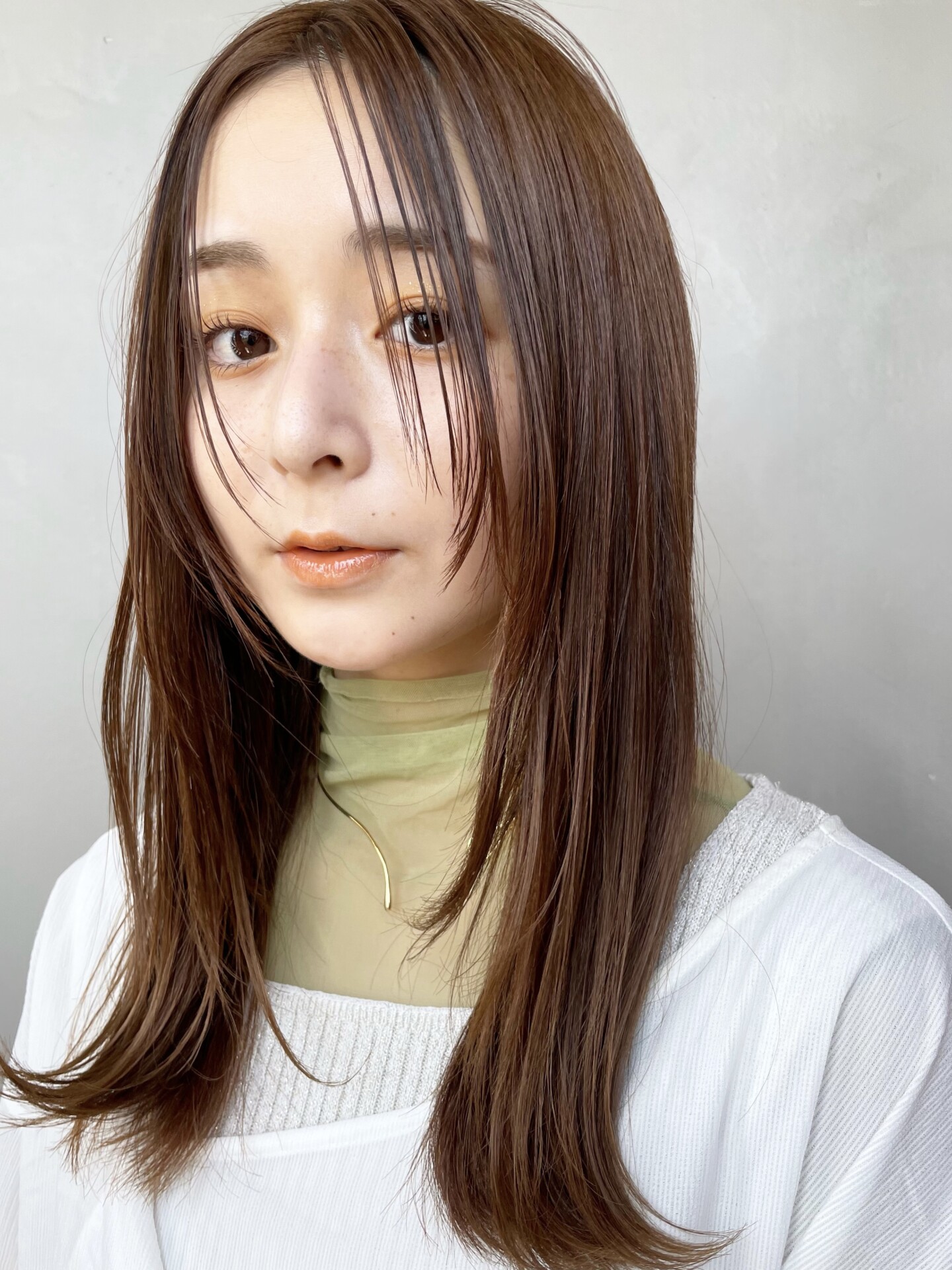 センターパートでぱらっと落ちる前髪が可愛いナチュラルなセミロングスタイルです。ヘルシーなストレートタッチでスソに厚みを残す事でまとまり、扱いやすさ◎です。外ハネと顔周りにだけ入れたレイヤーで春夏らしい季節感もプラス。可愛い&スタイリング簡単ヘアで春夏もヘアを楽しみましょう!